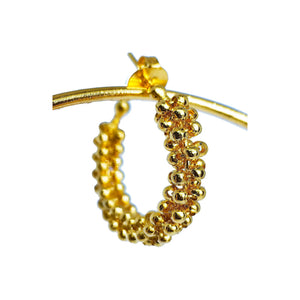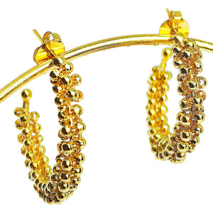 Déjate seducir por la textura vibrante de la Candonga Granada, una joya dorada inspirada en la riqueza de la fruta que simboliza abundancia y feminidad. Su diseño voluminoso con esferas entrelazadas y acabado en baño de oro 24k evoca la forma de los granos de granada, capturando la luz en cada movimiento.